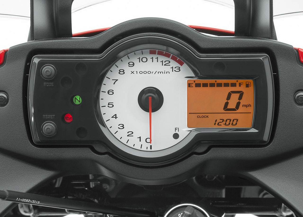 All new instrument panel features white LED backlighting for increased visibility at night. Features include a digital speedometer, analogue-style tachometer, digital fuel gauge, odometer, dual trip meter, and traditional warning lights.